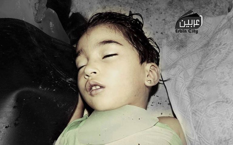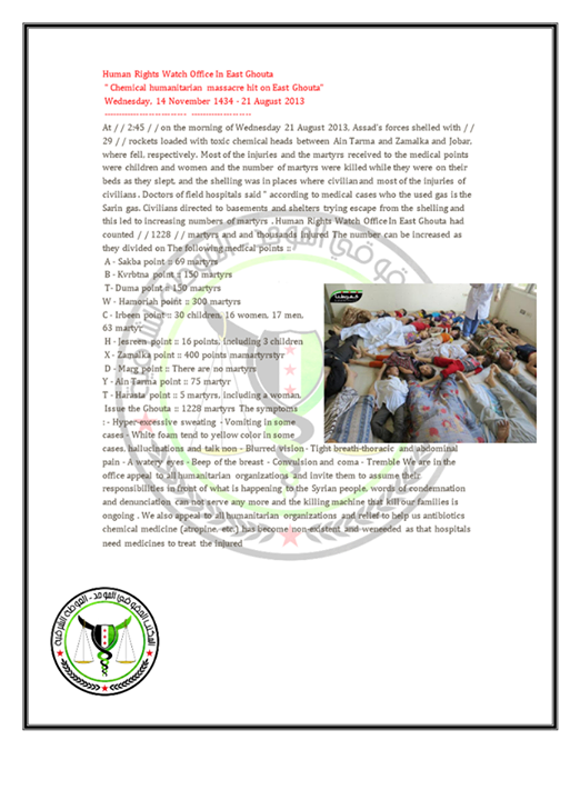 At // 2.45 // on the morning of Wednesday 21st August 2013, Assad’s forces shelled with // 29 // rockets loaded with toxic chemical heads between Ain Tarma and Zamalka and Jobar, where fell, respectively. Most of the injuries and the martyrs received to the medical points were children and women and the number of martys killed were on their beds as they slept, and the shelling was in places where civilian and most of the injuries, civilian. Doctors of field hospitals said ” according to medical cases who the used gas is the Sarin gas. Civilians directed to basements and shelters trying escape from the shelling and this led to increasing numbers of martyrs . Human Rights Watch Office In East Ghouta had counted / / 1228 / / martyrs and and thousands injured The number can be increased as they divided on The following medical points ::