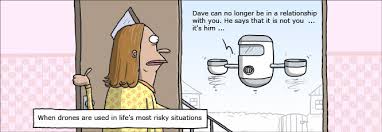 So as technology progresses further and commercial and personal drones become more user friendly, will we see ordinary citizens adapting them in illegal ways, perhaps even using them for personal vendettas. Drones can be operated on land, sea and air, with seemingly endless possibilities for use depending on practicalities and individual imagination. In the future will we see the jealous husband or wife using personal surveillance drones to track the movements of their spouse or as this cartoon depicts advise of a relationship break-up.
