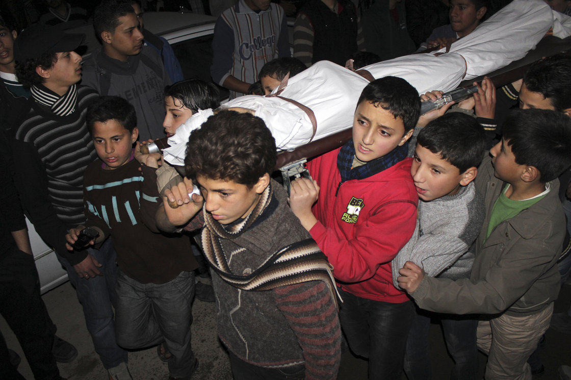 Children carry the body of a friend who was killed by shelling during heavy fighting between the Free Syrian Army and the forces of Syrian President Bashar Assad in Damascus earlier this year (photo, Mohamed Dimashkia, Reuters)