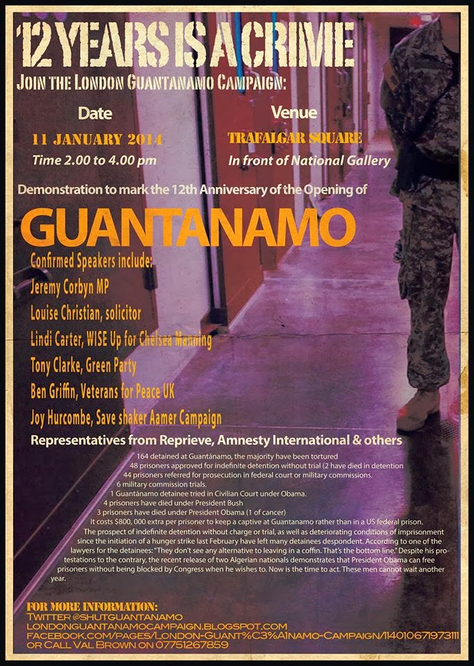 In the UK in 2014, “close Guantanamo” and anti-drone protests continue. On the 11th January campaigners will gather in Trafalgar Square to mark 12 years since the opening of Guantanamo and call once again for its closure. Protests and legal action will be ongoing until we see results http://londonguantanamocampaign.blogspot.co.uk/2013/12/london-marks-12- years-of-guantanamo-bay.html