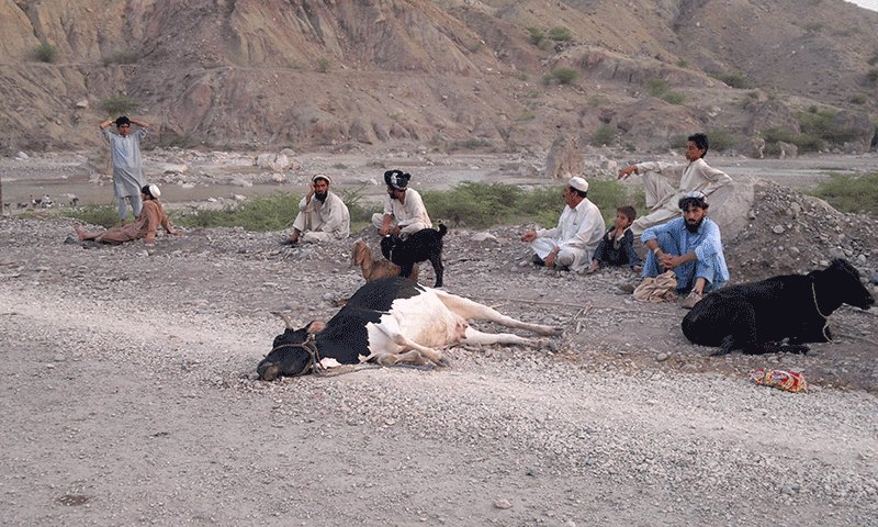 Humans and animals dying on route (left) and waiting for food rations (right) photos via Abdul Rehman Dawar