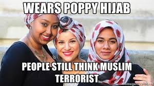 The introduction of the poppy hijab to celebrate centenary events and raise money for soldiers is promoted by a “think tank” British Future and various media but has not gone quite according to plan. For a start, one of the young women featured wearing the headscarf is now claiming she was not informed this was for a national campaign and thought she was only posing for photographs for a designer friend. She has apparently suffered some backlash from fellow Muslims and is clearly not happy that she was unable to make an “informed choice” regarding participation in a somewhat controversial campaign.