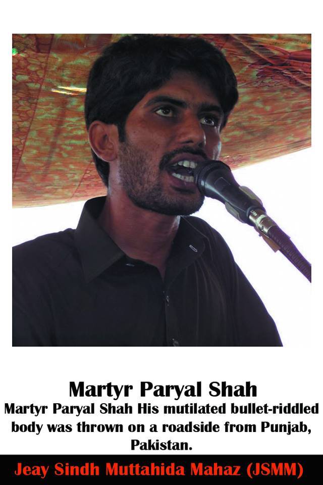 “martyr Asif Panhwar was a student of I.T. Department of University Of Sindh Jamshoro. He was abducted from University 100 days ago. His crime was that he had demanded the freedom of his country, Sindh. A historical country which was occupied by Pakistan through British strategy. Sindhi from the whole world must have to unite to make free Sindh from the chains of Pakistan, otherwise Sindhi would be killed continuously”