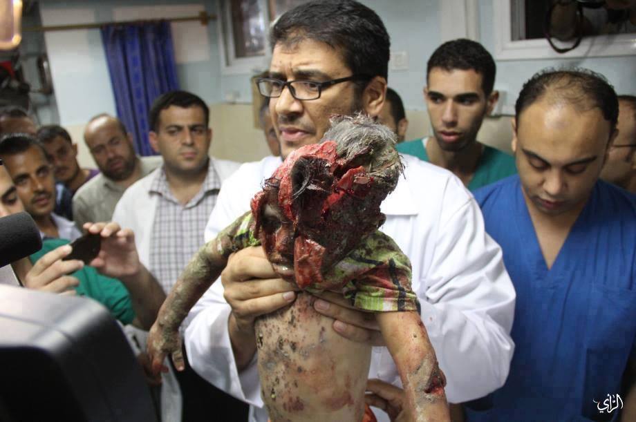 Dr Mads Gilbert (left) and staff member holding the remains of a child (right) during bombing of Gaza by Israel