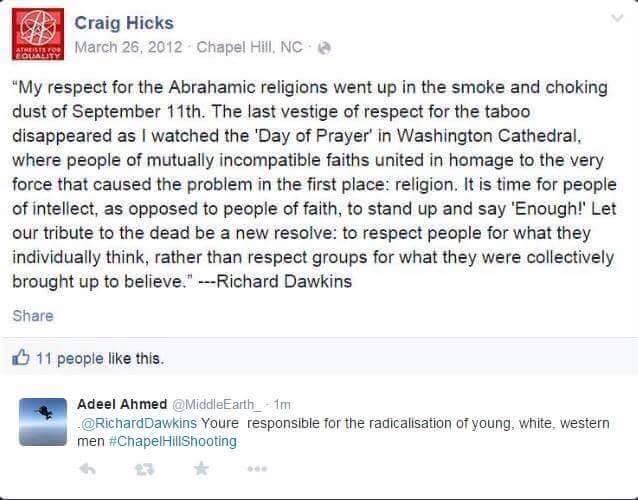 Richard Dawkins (English ethologist, evolutionary biologist, and writer) took to Twitter to condemn the killings tweeting “how could any decent person NOT condemn the vile murder of three young US Muslims in Chapel Hill?” Hicks, whose Facebook page says he is married and studied paralegal at Durham Technical Community College, made a post referring to Dawkins in 2012 (see below). There was also a new comment from Adheel Ahmed alleging Dawkins was “responsible for the radicalization of young, white, western men” (view screenshots)