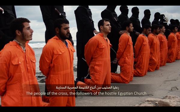 The victims are Egyptian Coptic Christians allegedly captured in Libya. Men dressed in the usual orange jumpsuits contrast with the grey of the water as each is walked along “the coast of Wilyat Tarabulus by the Mediterranean Sea” accompanied by a masked jihadist in black. They are made to kneel, some man appear to be mouthing what may be good byes to a loved one, a final prayer. Then they are lowered face down on the sand and decapitated…. their life blood draining away with the waves.