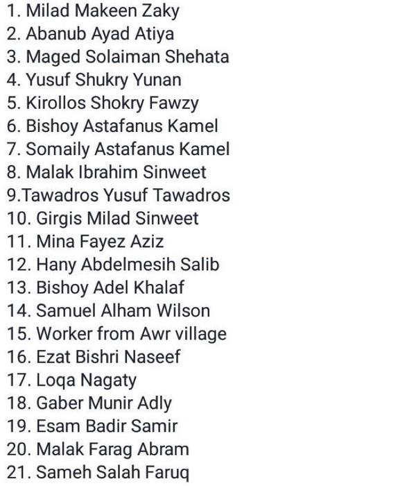 One man named Michael tweeted the list of names of 21 Egyptians known to be held by IS, see below, though as yet deaths have not been independently confirmed