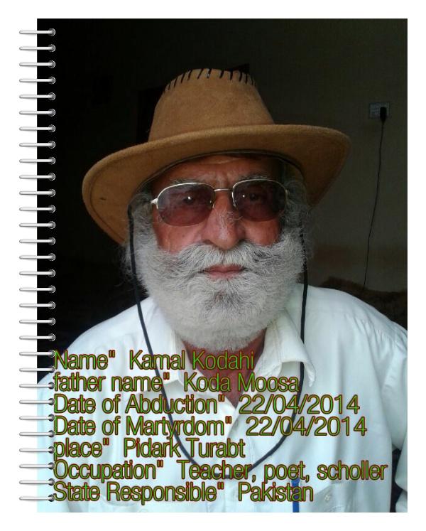 “he was a notable school teacher, Pakistan is killing the Baloch intellectuals, he is not the first and may not be the last. It is a process and stage of Genocide which Pakistan aims to. Bangladeshi history is being repeated here.We are against torture and terrorism. Peaceful Baloch are abducted, killed and dumped by Pakistan. The silence of human rights organizations and UN (United Nations) has given free hand to Pakistan. Lets find an end to injustices. Lets liberate ourselves from Pakistan. The only solution is to reinstate the free status of Balochistan.”