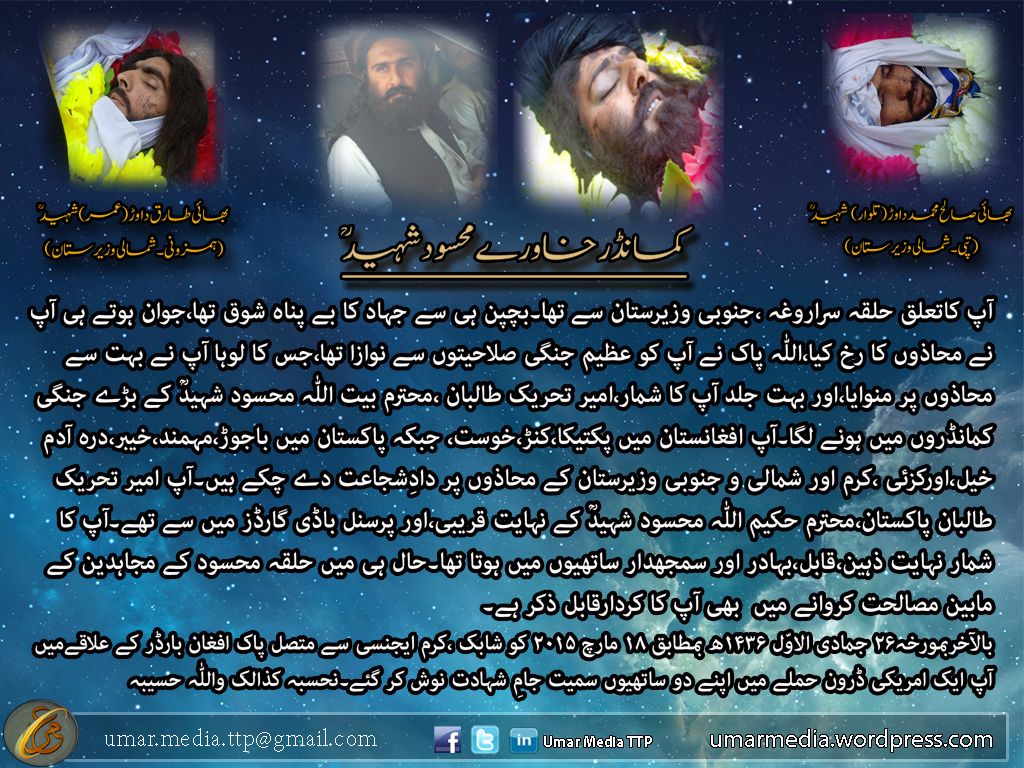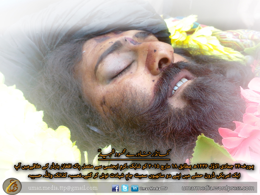 Tehreek -e-Taliban Pakistan (TTP) spokesperson Muhammad Khorasani sent a press release on Thursday to a list of journalists informing them of the targeted drone killing of senior militant commander Khawrey Mehsud who had been a close aide to former TTP Emir Hakimullah Mehsud.