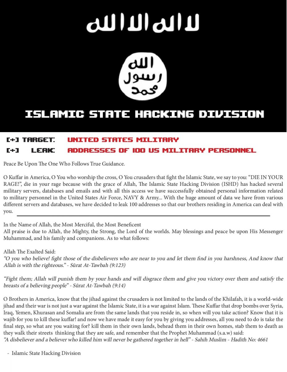 In a continuation of the “Die in your Rage” phenomena, the Islamic State (IS) “hacking division” have allegedly been hard at work accessing the names, addresses and photographs of 100 US military personnel according to their latest press release to selected journalists and social media reporters. They claim to have hacked “military servers, databases and emails” and the statement includes the images of armed service personnel with details of the area in which they serve .
