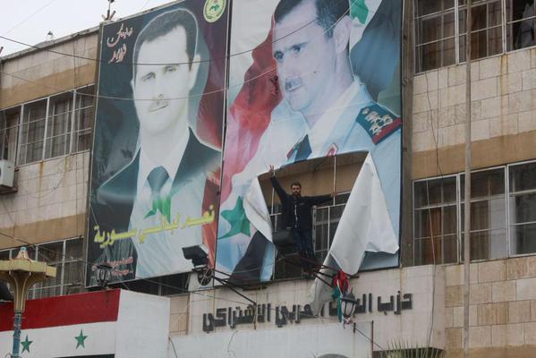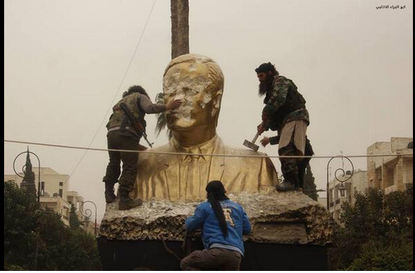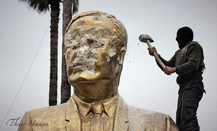 Images appeared on social media purporting to show a large poster of Bassar al-Assad being ripped down from the Ba’ath party building. Another photo shows a masked fighter bashing the head and shoulders of a statue of Assad with a hammer. The following videos show rebels enjoying their victory in Adlib firing shots in the air and singing in celebration.