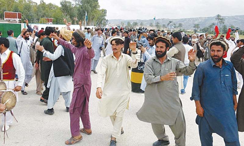 BANNU: Internally displaced people dance at the Kajuri Checkpost to celebrate their return to their homes here on Tuesday.—INP (via Dawn)