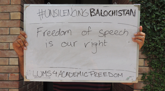 The Democratic Students’ Alliance, an informal student organisation some of whose members are students at the Lahore University of Management Sciences (LUMS), posted this message on its Facebook page at 7:24pm on Wednesday. The message was posted hours after a talk on the LUMS campus about human rights issues in Balochistan was cancelled allegedly under duress.