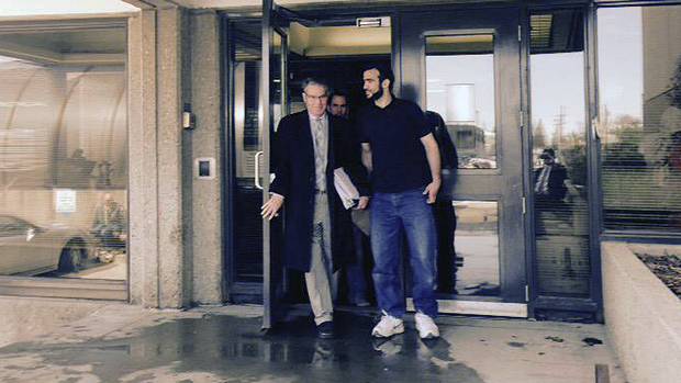 Omar Khadr, left, with his lawyer Dennis Edney arrives at Edney’s home in Edmonton, Thursday, May 7, 2015. The former Guantanamo Bay prisoner Omar Khadr got his first taste of freedom in almost 13 years.