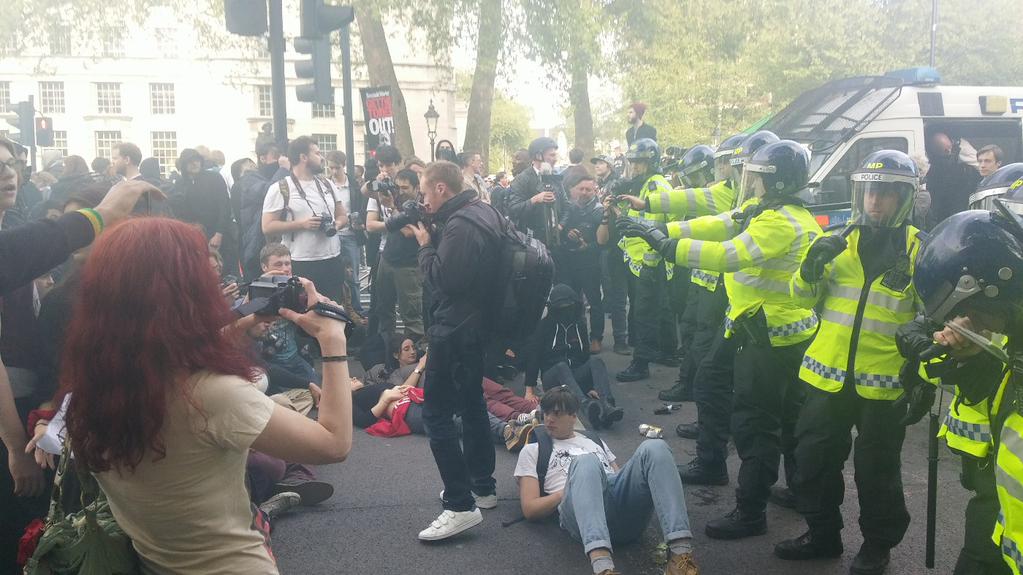The protest turned to scuffles, showing campaigners lying on the ground and photos emerged showing the tension between members of the crowd and police in riot gear. Kettling tacts were used to contain the crowd in designated areas and police horses were on the streets. There were reports of several arrests.