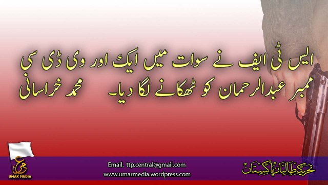 The CTF created by Tehreek-e-Taliban have been successfully carrying out their targets of achievements. And another front line member of the Kufr, Abdul Rehman Asad s/o Muhammad Shafiq resident of Khawar Pilao, Char Bagh was targeted in broad daylight. Where as the mujahadeen disappeared successfully, we will target each and every one of the worshipers of kufr and democracy. Muslim brothers who love Islam and Shariat are requested that they stay away from these people. Tehreek-e-Taliban Pakistan’s new war strategy is proving to be extremely successful, because of which the govt promises have been left unfulfilled. And InshAllah that day is not far when our beloved nation Pakistan will achieve it true stature and status meaning it will become established on lâ ilâha illâ allâh (There is no god but Allah) and the enemy of Islamic Tehreek the democratic forces will be destroyed and eliminated completely.
