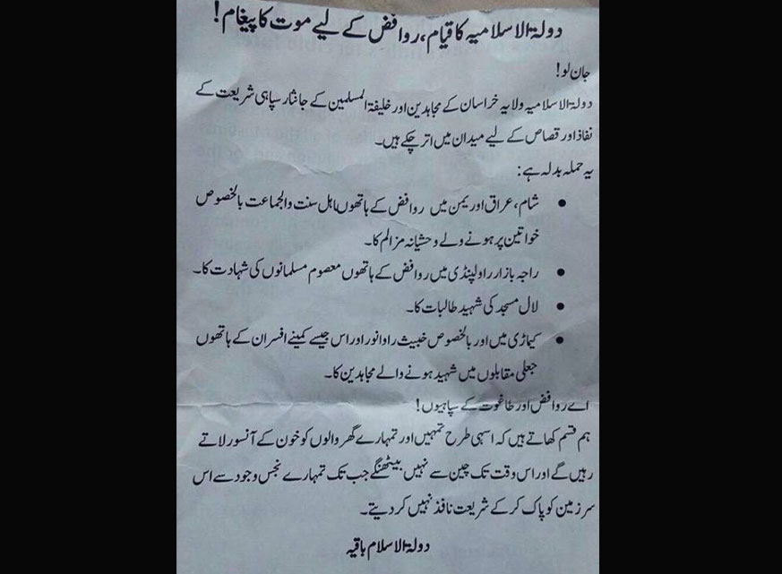 Journalist Wajahat S Khan tweeted the following, “ISIS-inspired group leaves pamphlets on the site of the Karachi Bus Attack; @ NBCNews gets the pictures.” See leaflets below..