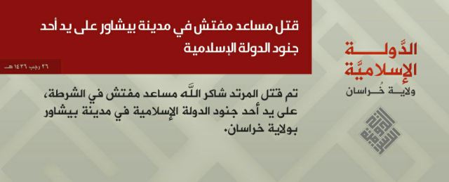 Wilayat Khorasan (Islamic State in Afghanistan, Pakistan) are making their presence felt in Peshawar with another statement release claiming the killing of Shakirullah Khan, an assistant sub-inspector of police. He was shot dead on his way to his office by motorcyclists on Wednesday morning. DAWN media stated.