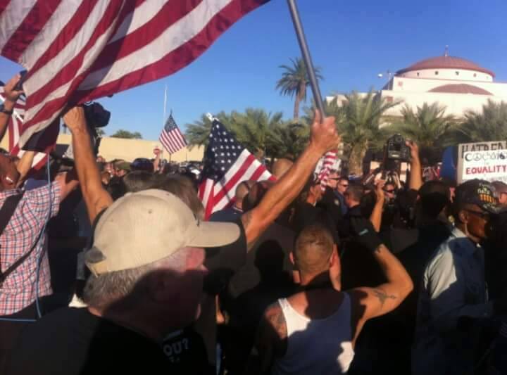 Throng of gun-toting racists screaming outside a peaceful worship service. Who are the violent extremists? #NotMyAmerica #PhoenixMosque
