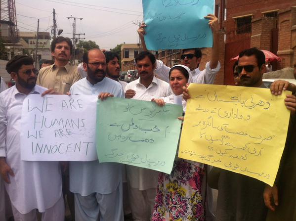Tribal elders along with Jameela Gilani and members of Pukhtoon S.F are now holding a protest outside Peshawar Press Club against the killing of IDPs in Baka Khel Camp. Banners were raised displaying slogans which read, “we are humans, we are innocent” “we are Pakistani not terrorist” and “stop Pashtun genocide”. Waziristan students criticised the army for killing IDPs. Images of the demonstration were posted on Twitter by Tariq Afghan, a lawyer and political scientist who works for peace, human rights and is a social activist.