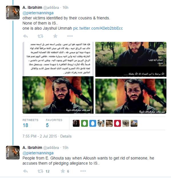 Islamic State have also allegedly been on the receiving end of “violence via video” as shown in a recent video featuring Jaysh Al-Islam ‘Army of Islam’ dressed in orange jumpsuits that executes 13 members they claim are Islamic State. However as Pieter Naninnga points out in tweets on 2nd July some dispute the claims…