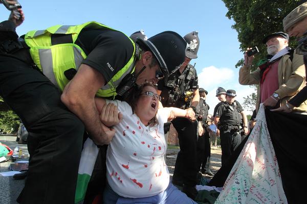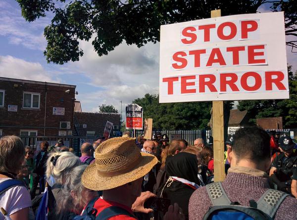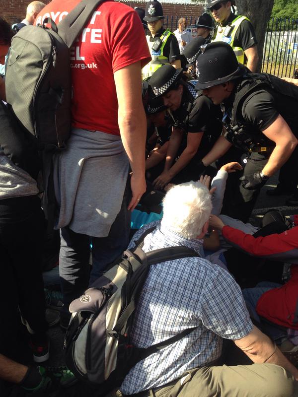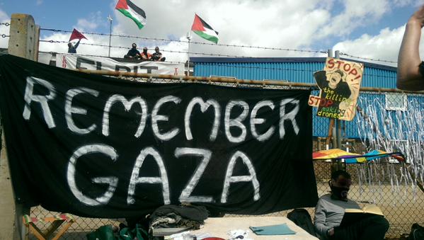 It is a now a year since a brutal Israel assault bombarded civilians in the Gaza Strip causing terrible injuries and significant loss of life in actions which many human rights groups allege are “war crimes”. Block The Factory website states, “according to the UN, during its attack on Gaza last summer, Israel killed over 2,200 Palestinians including more than 500 children. Approximately 11,000 people were injured, including 1,000 children left with permanent disabilities. An estimated 18,000 homes were destroyed or severely damaged, making 100,000 people homeless.” The use of armed drones which inflict considerable “collateral damage” is supported by the UK government and protesters are repeating their call for Britain to “Stop Arming Israel”. A posting on the website read,