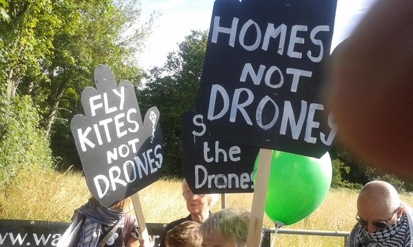 Protesters lay on the roads to stop access to the factory site while others tied ribbons in remembrance of those killed in drone strikes.