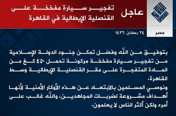 “through God’s blessing, Islamic State soldiers were able to detonate a parked car bomb carrying 450 kg of explosive material on the headquarters of the Italian consulate in central Cairo.”