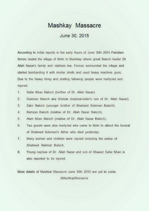 “On June 30th 2015, Pakistani Army attacked Mehi village in Mashkay, some 400km from Quetta, the hometown of Balochistan Liberation Front (BLF) supreme commander Dr. Allah Nazar Baloch. Army began aerial shelling and spraying bullets with helicopter gunships on the village and nearby mountains and then ground troops moved in breaking into civilian houses. In that carnage totally 11 people were brutally massacred including Dr. Allah Nazar’s elder brother Safar Khan and two of his nephews Suleman aka Shehak and Zakir Baloch aka Seth.
