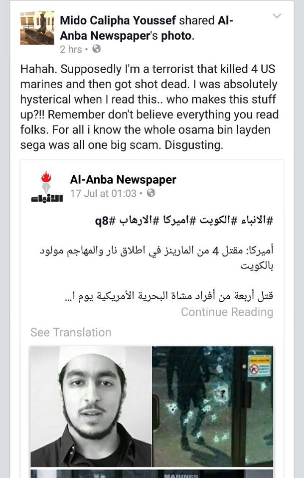 Mido Calipha Youssef was WRONGLY identified as the Chattanooga shooter by Al Anbar newspaper who featured his photo next to a story of Mohammad Youssuf Abdulazeez, the actual shooter. The following image was posted.