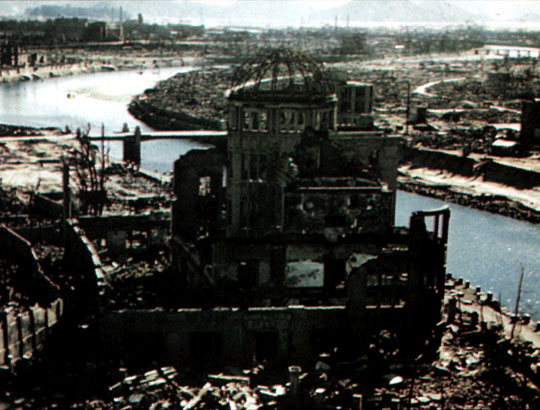 Looking north from the Chamber of Commerce stands the Atomic Bomb Dome (Image, Hiroshima and Nagasaki remembered)