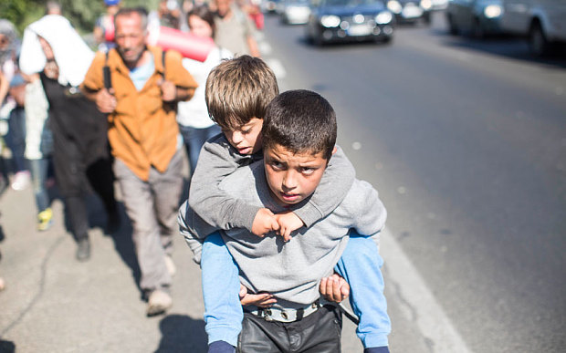 Refugee’s walk down the M7 towards Austria Photo: Warren Allott/Telegraph