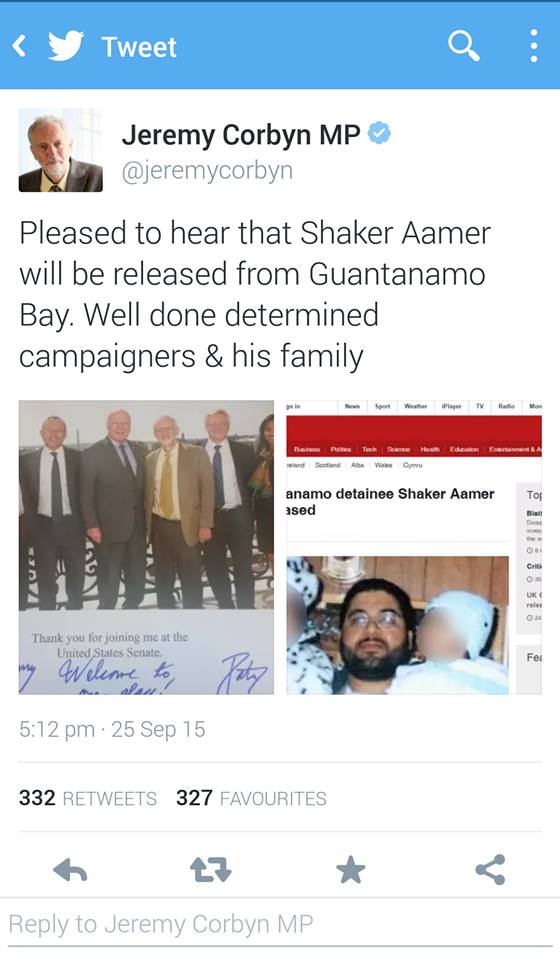 A delegation of MPs, including new Labour leader Jeremy Corbyn, lobbied Washington to release Shaker after his case was debated in the House of Commons in March. As Andy Worthington investigative journalist with a website on Guantánamo wrote,