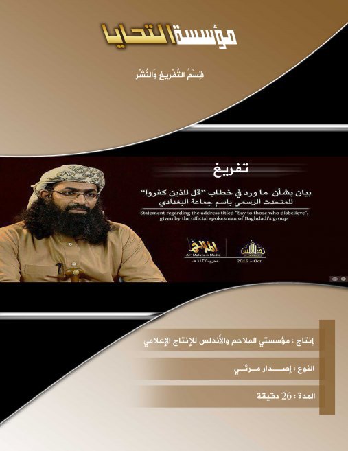 I read this statement on behalf of my brothers in Qaedatul Jihad in Maghribil-Islam and the Arabian Peninsula. Commenting on the address made by the official spokesman of Baghdadi’s group, titled: (“Say to those who disbelieve: “You will be defeated…) {3:12}. The address contains a number of jumbles and misfortunes that have forced us to take a stand, a righteous and truthful stand … (that those who perished would perish upon evidence and those who lived [in faith] would live upon evidence; ) {8:42}.