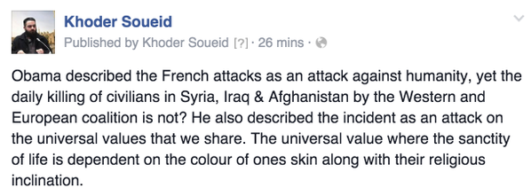 “I won’t be changing my profile to the French flag even though I am French and from Paris. The reason for this is that if I did this for only Paris this would be wrong. If I did this for every attack on the world, I would have to change my profile everyday several times a day. My heart is with the world, no borders, no hierarchy, I hold every human’s life with value who is attacked by extremist beliefs whether they are based on religion, prejudice or profit! Don’t be part of the “us and them” mentality which the war mongers want you to do”