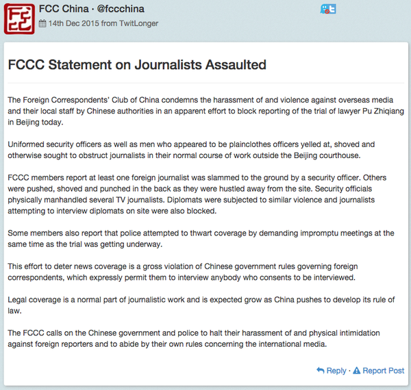 Fergus Ryan, a Beijing based journalist posted the Foreign Correspondents’ Club of China statement on assault of journalists outside Pu Zhiqiang’s trial.
