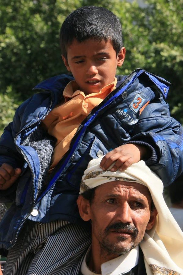 “Yemen blind boy with father appealing to humanity for stopping Saudi war crimes after destroying blind school” Nasser Arrabyee