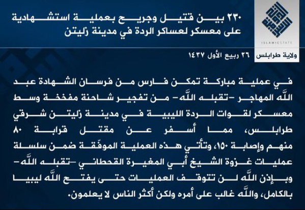 Islamic State (IS) have released a statement claiming responsibility for a truck bomb at the al-Jahfal training camp Zliten, Libya on Thursday which killed over 50 at the police base, injuring a further 118 people. Wilayat Trablous were named as the group responsible. IS says it also carried out another attack on the same day at the oil port of Ras Lanuf, which killed seven people.