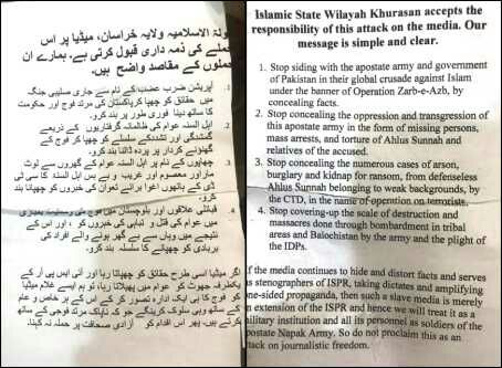 ARY News also came under attack from Islamic State (Wilayat Khorasan) with one person reported injured when their Islamabad office was targeted with a hand grenade and gunshots.