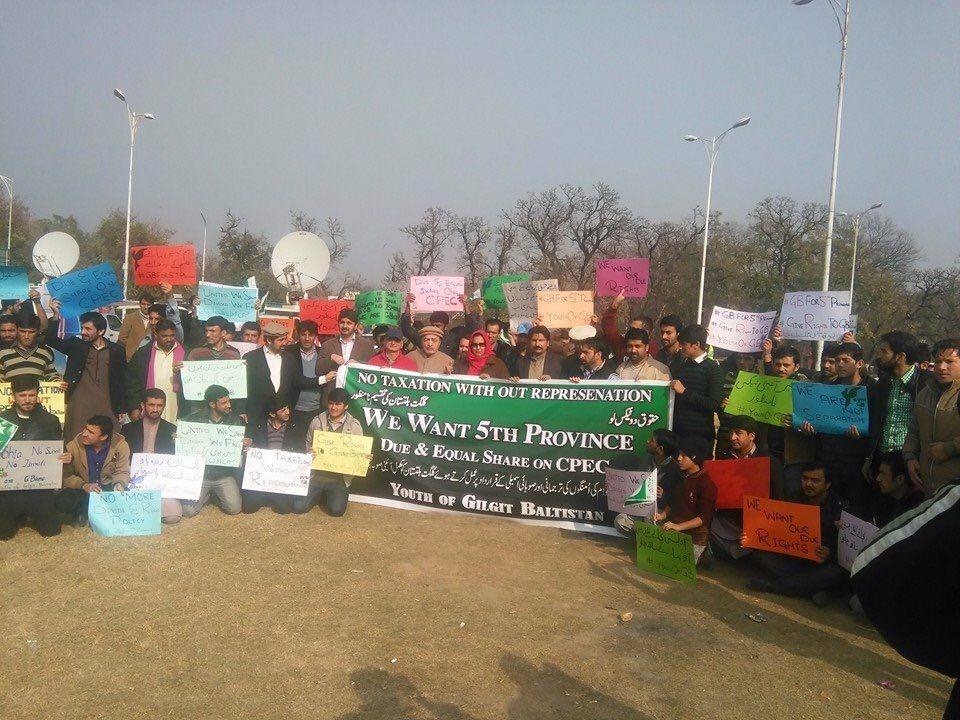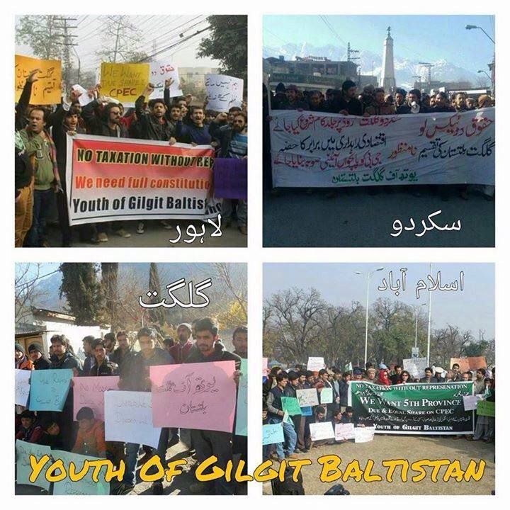 A protest rally was organised by Gilgit- Baltistan youth against the tax imposition, discrimination in the shares of economic corridor and constitutional issues of GB. Rallies were held throughout in different cities of Pakistan, Islamabad, Lahore, Karachi, Skardu, there a joint resolution was handed over to the president of the Press Club which reads as follows.