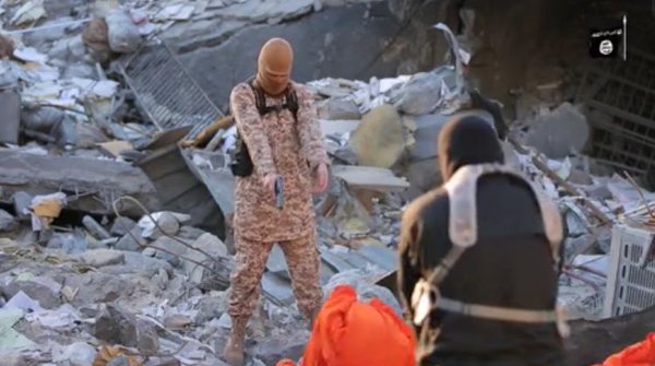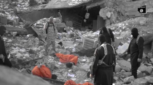 The man in military fatigues appears to be the ringleader. A French-speaking man delivers his message in French to the west. He appears light skinned and blond curls are visible from under a beige mask. There are also shots of the remains of a body and a child horribly injured apparently in an air strike. The captives are later shot, their eyes uncovered and whilst facing each other in a circle.