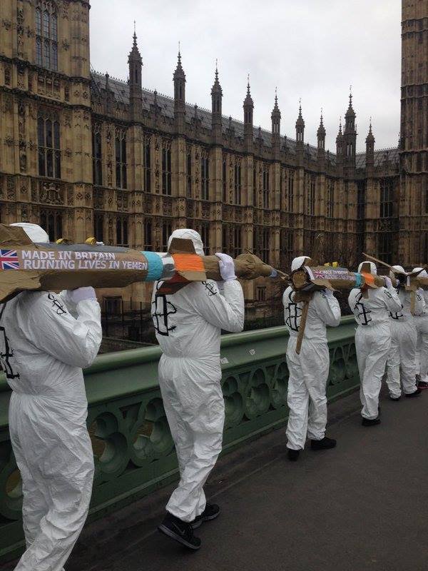There were demonstrations also outside Downing Street to highlight the British government’s role in arms trade with Saudi Arabia. Those participating wore white space suits and carried mock arms. As well as conventional weapons there have been major concerns regarding the use of cluster bombs (banned in many countries) and chemical weapons in the region.