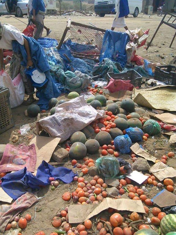 Nasser Arrabyee, Yemeni Journalist, Film-maker, Owner and Director of Media Production Company (Yemen Alaan, meaning Yemen now) posted the following photographs of Al Khamis market bombing on Twitter showing remains of bodies and shattered buildings.