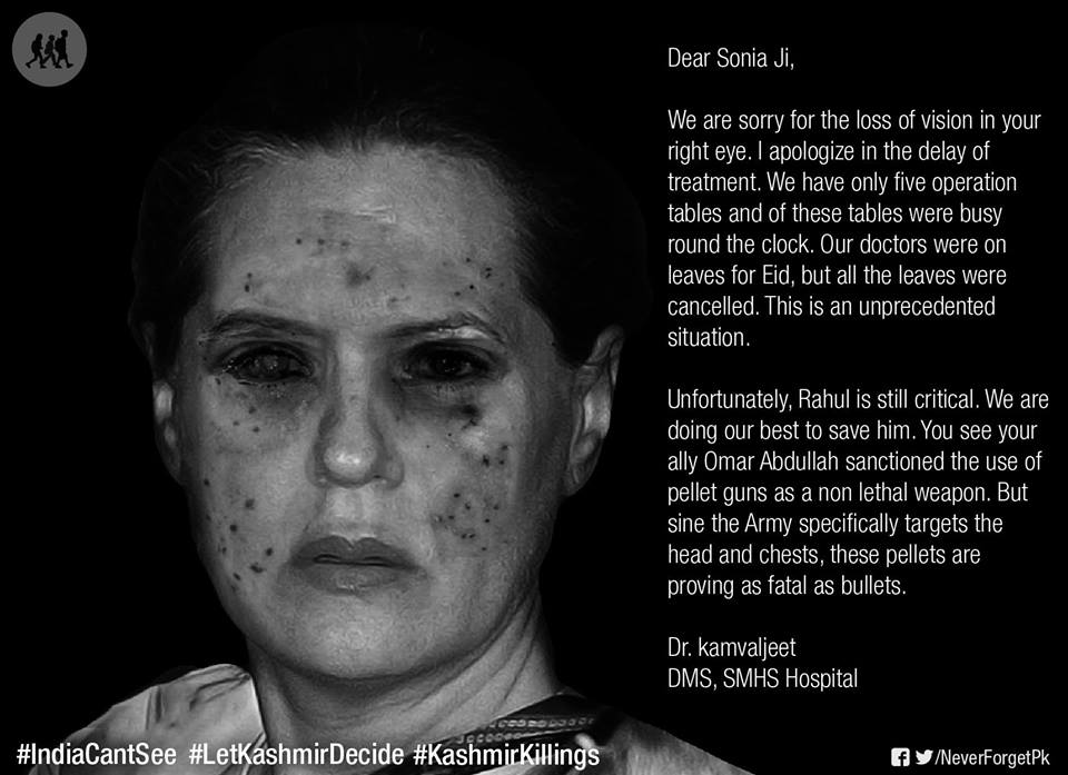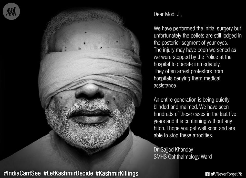 “Just only at SMHS Hospital, Srinagar from 9th to 22nd July around 450 persons have been brought from various areas. Out of these 450 persons, 142 have eye injuries. 123 persons have gone through eye operations and among them 40 have both eyes affected. Doctors worry that many of the eye injured may lose their eyesight. He gave his approval of the campaign adding, “this needs to spread across. We hope more such campaigns will be undertaken by friends in India, Pakistan and elsewhere.”