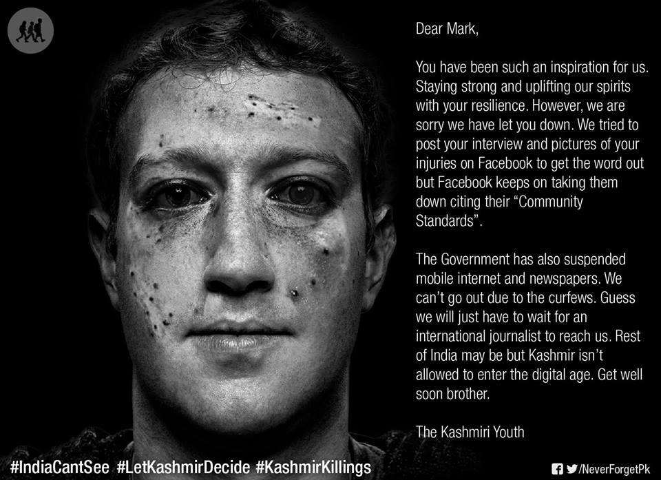 This campaign is designed to highlight the atrocities and abuses carried out by the Indian Armed forces and Police who enjoy complete immunity under the Armed Forced Special Powers Act which has made a mockery of India’s claim to be a secular democracy. Scores have been blinded, several killed and hundreds injured by what India describes as a “non-lethal” weapon i.e. the pellet gun. We condemn and lament the criminal silence and inaction of the Indian Government and Cultural icons of India. Furthermore we strongly condemn the pick and choose policy of Facebook which convenient censors posts highlighting the plight of the Kashmiris and later excuses itself by calling the censorship a “mistake”.