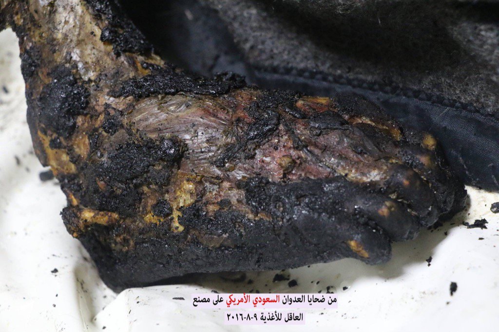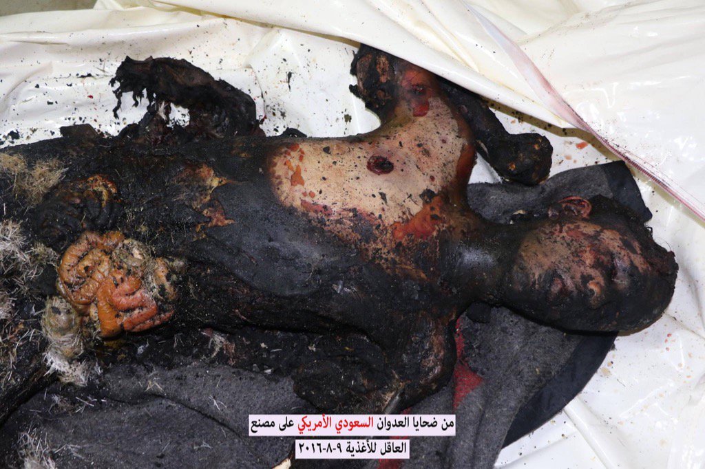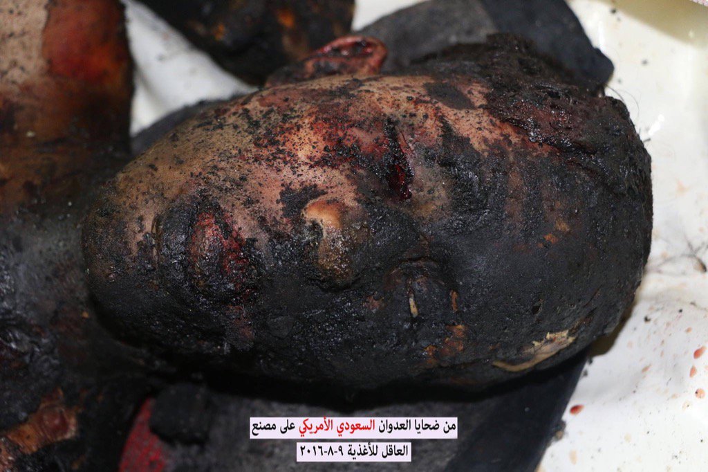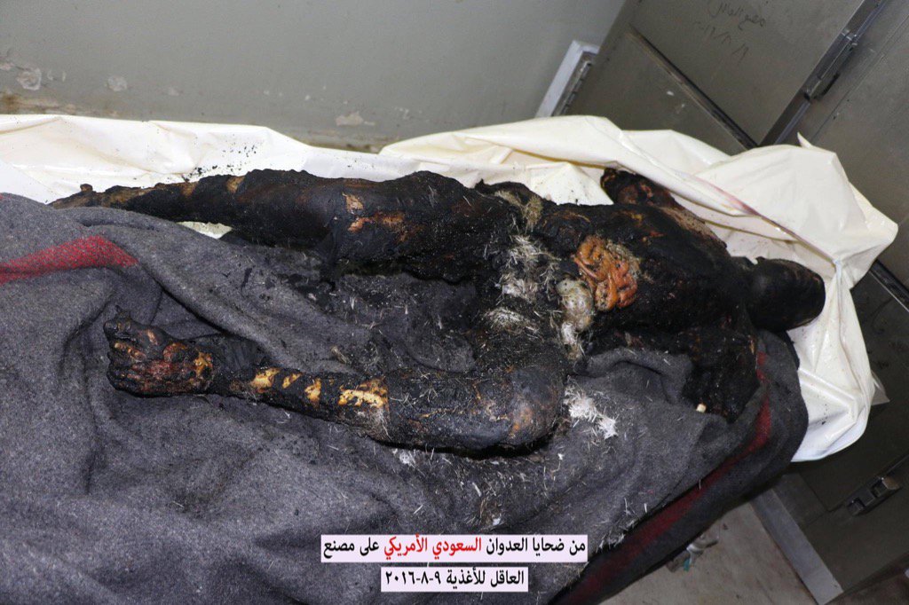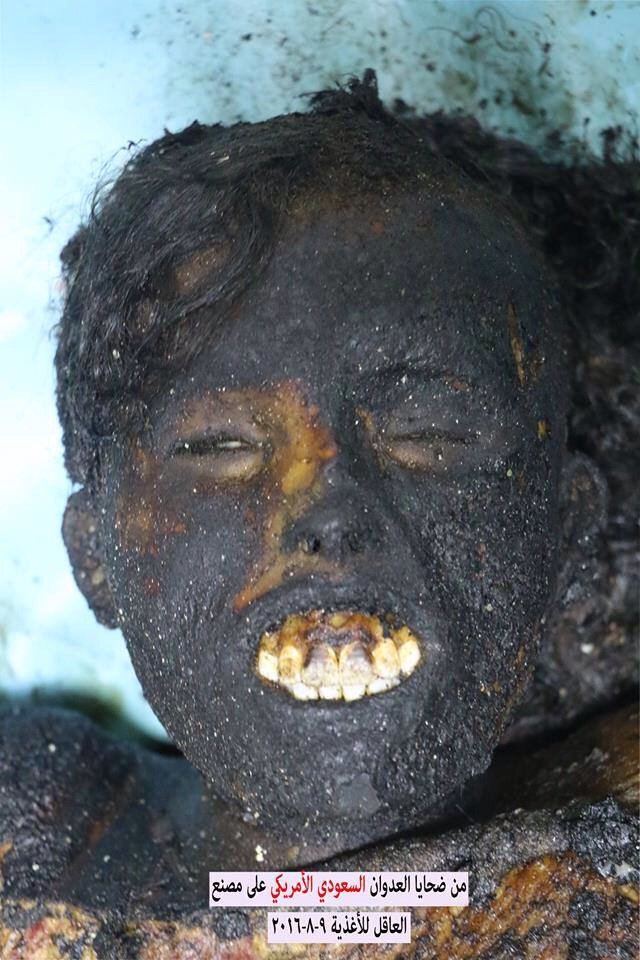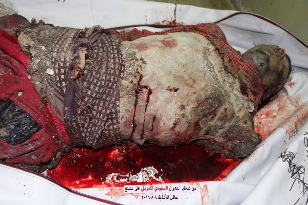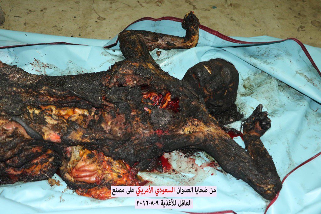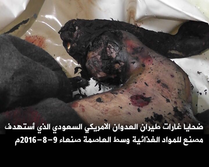 US-backed Saudi coalition air strikes coalition jets bombed the Akel food factory in the Nahda district of the Yemeni capital of Sanaa on Monday, killing at least 16 workers. The deceased included women and children who suffered horrific burns.