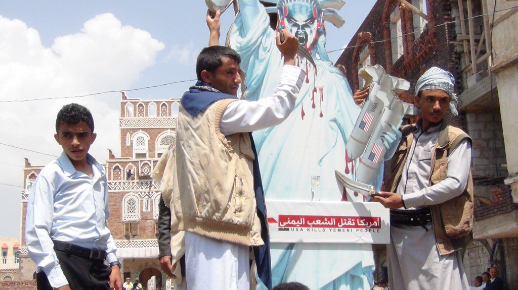 Such was the anger at recent attacks, pictures circulated on social media showing Yemenis angry at alleged US-backed Saudi war crimes stabbing a picture of the Statue of Liberty declaring this a” BIG lie from Obama”