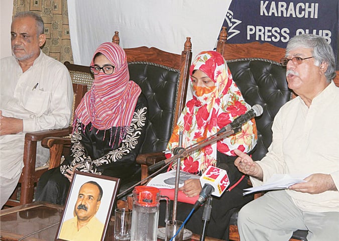 Accompanied by the daughters of the missing Baloch activist, an HRCP official speaks at a press conference at the Karachi Press Club, August 2016