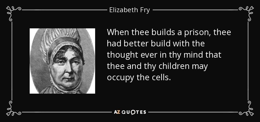 Elizabeth Fry a famous English prison reformer gave good advice when she said, when you are building a prison you should build it with the thought in mind that you and your children may occupy the cells. Known as the “angel of the prisons” her work was so important in the history of penal reform that her image was depicted on the reverse of £5 notes issued by the bank of England.