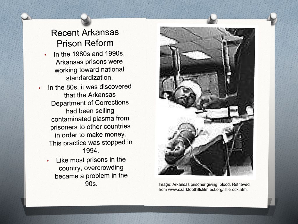 In the 1980s and 1990s, Arkansas prisons were working toward national standardization. In the 80s, it was discovered that the Arkansas Department of Corrections had been selling contaminated plasma from prisoners to other countries in order to make money. This practice was stopped in Like most prisons in the country, overcrowding became a problem in the 90s. Image: Arkansas prisoner giving blood. Retrieved from “Prison Reform In Arkansas”